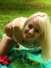 The hottest picnic you'll ever see! The flexible blonde loves nothing more than having fun in the nature, so she went outside, spread a blanked on the green grass, and took off her clothes. Then she stuffed her bald cunt with a huge cucumber.