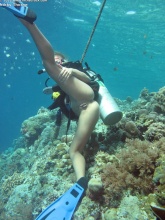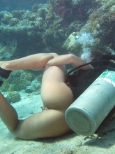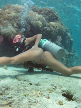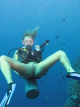 Sexy scuba diving girl wants nothing more than to dive and masturbate underwater. She couldn't resist herself so she had to play with her bald cunt while she was diving. Then she climbed out and posed for you so you can check her out better.