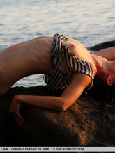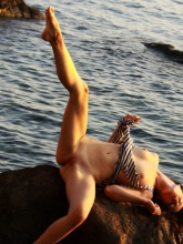 Janelle B, showcases her amazingly flexible and toned body on the rocky beach.
