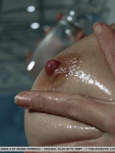 Karine, dips in the bathtub and starts touching herself then showcases her magnificently oiled body as she finger fuck her wet unshaven pussy.